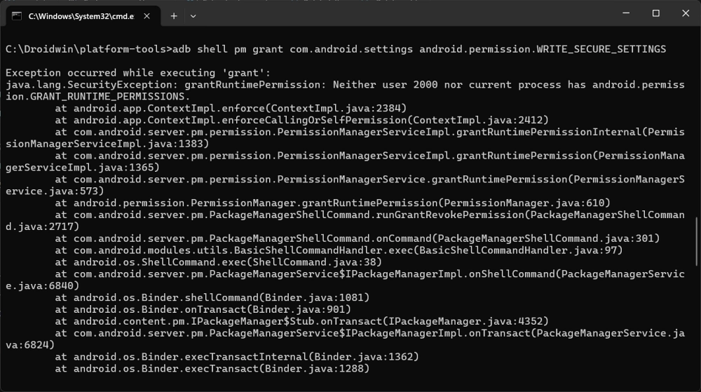 Similarly, the "Exception occurred while executing ‘grant’" error arises when a user attempts to manually bestow runtime permissions upon an application via the ADB shell. This is common when using third-party customization tools that require the WRITE_SECURE_SETTINGS permission to function. The error log typically states that neither the shell user nor the current process possesses android.permission.GRANT_RUNTIME_PERMISSIONS. In the eyes of the Android security model, granting permissions is a high-level administrative task. Even though the user has connected the phone to a computer and authorized USB debugging, the system remains skeptical of commands that could fundamentally alter the app-level security sandbox.