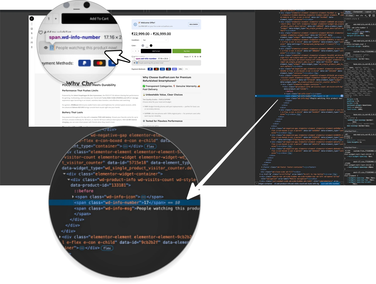 Upon visiting the GudFast interface, a common e-commerce "dark pattern" becomes immediately apparent. The product pages prominently display a live visitor counter, stating that a specific number of people are currently viewing the item. To the average consumer, this creates a sense of "Fear Of Missing Out" (FOMO) and psychological urgency, suggesting that the product might sell out at any moment. However, a technical audit of the website’s front-end code reveals a different reality. By utilizing the "Inspect Element" tool on the browser, the underlying HTML structure exposes the use of the WoodMart theme’s "Visitor Counter" widget.