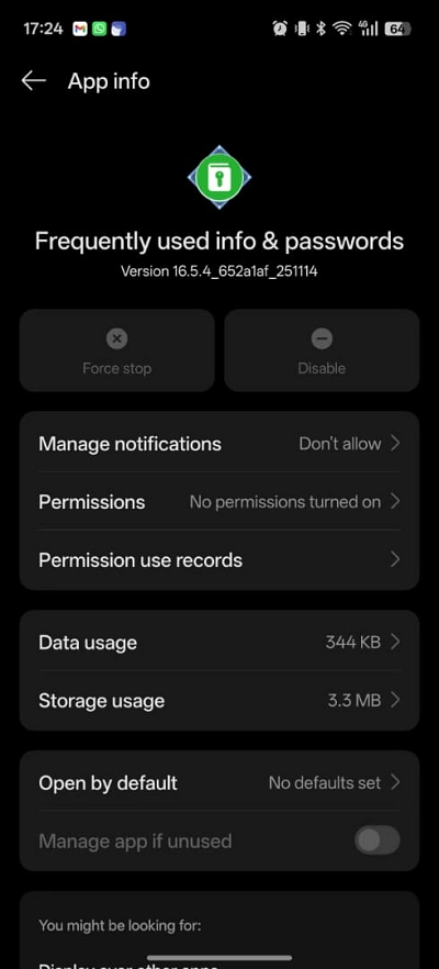 The frustration for the end-user is compounded by the persistent nature of this system component. Many affected individuals have attempted the logical first step: force-closing the app through the standard Android settings menu. Unfortunately, because "Frequently used info & passwords" is a core system-level service, it is programmed with high-priority persistence. Almost as soon as it is killed, the Android system restarts it to ensure that autofill functionalities remain available. This creates an exhausting loop where the user kills the service, opens their bank app, and finds the service has already resurrected itself, once again triggering the security block.