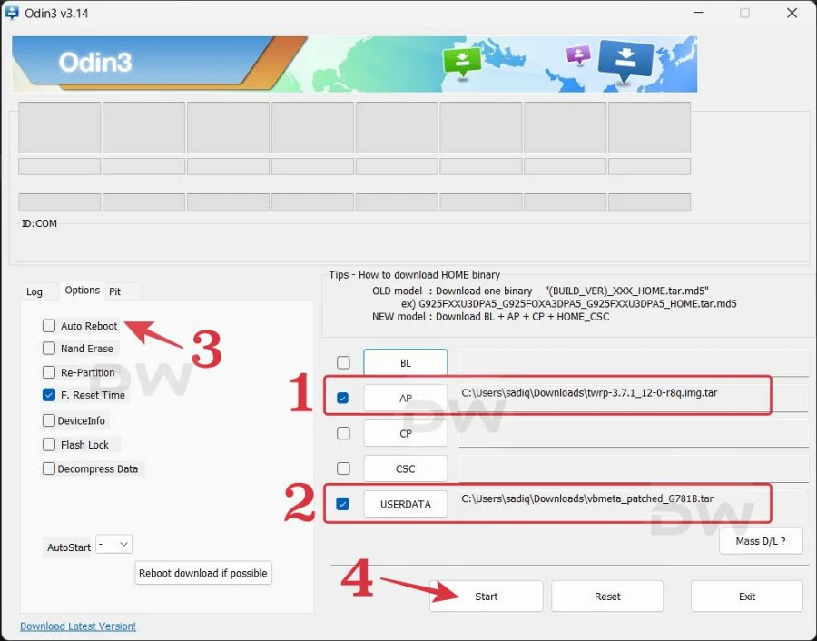 With the device in Download Mode, the user utilizes Odin on a Windows-based PC. The patched vbmeta tar file is placed in the USERDATA slot, while the custom recovery (OrangeFox or TWRP) is placed in the AP slot. It is vital to uncheck the "Auto Reboot" option in Odin’s settings. This prevents the device from immediately trying to boot back into the official system, which would likely overwrite the newly flashed recovery with the stock recovery. Once the flash is successful, the user must perform a manual hard-reboot using the Volume Down and Power keys, immediately transitioning to the Volume Up and Power combination to force the device into the custom recovery environment.